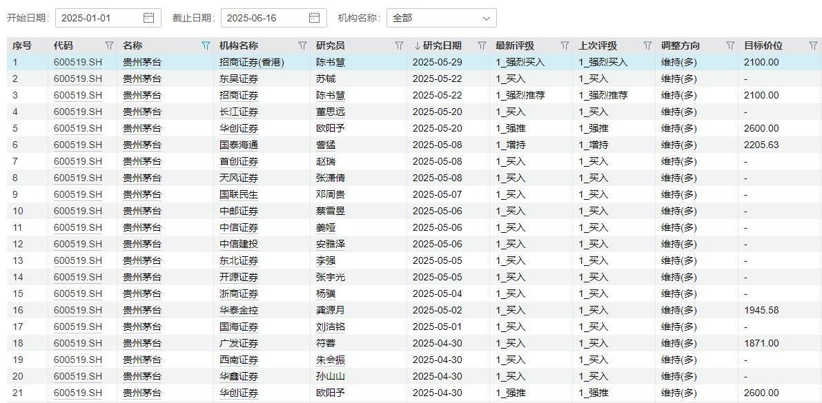 券商依旧看好茅台Wind显示,今年以来贵州茅台共获得92次评级,主要包括“买入”、“强推”、“增持”三大类,对比此前券商评级多维持不变。