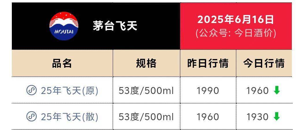 到了6月16日,散瓶价报1930元/瓶,原箱报1960元/瓶。据此计算,1个月内分别跌了7.21%、10.71%。